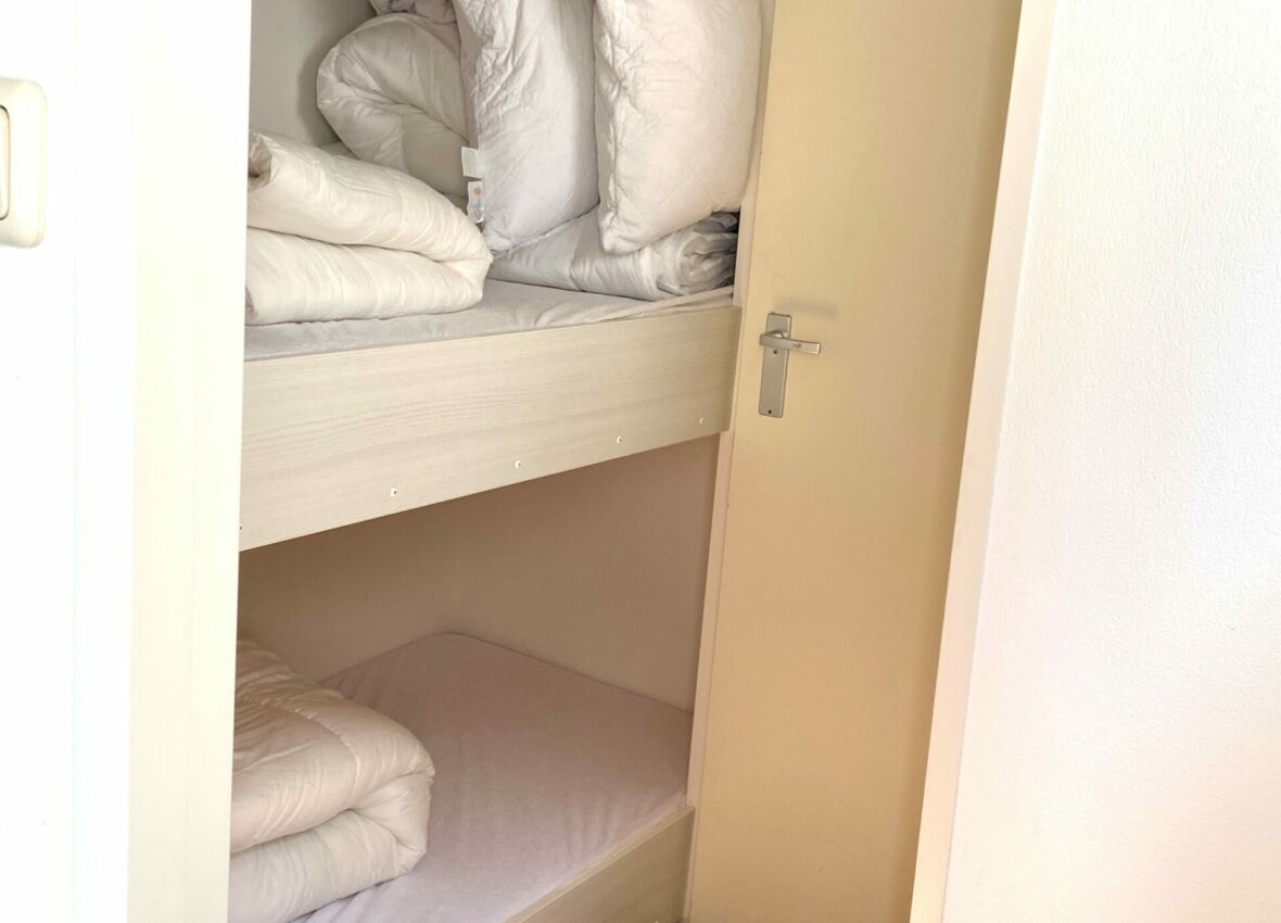 De zolder achterin het huisje biedt u de mogelijkheid om spullen op te bergen. Bij de hoogslaper vindt u een inbouwkast en klaptafel.